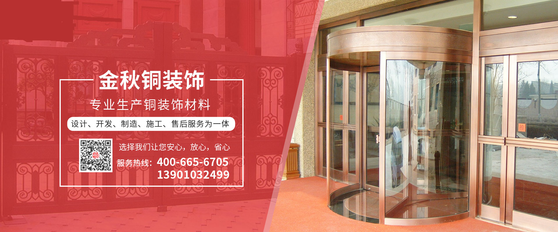 北京金秋銅裝飾材料有限公司是專業(yè)生產(chǎn)銅裝飾材料及設計、開發(fā)、制造、施工、售后服務為一體的大型綜合企業(yè)。可承接建筑銅裝飾工程及五星級酒店、別墅、博物館、樓樘管所等高檔銅裝飾項目;生產(chǎn)各種規(guī)格的旋轉(zhuǎn)門、平滑門、別墅門、電控門、工藝門、旋轉(zhuǎn)護欄、屋頂銅飾防水瓦、浮雕壁畫......